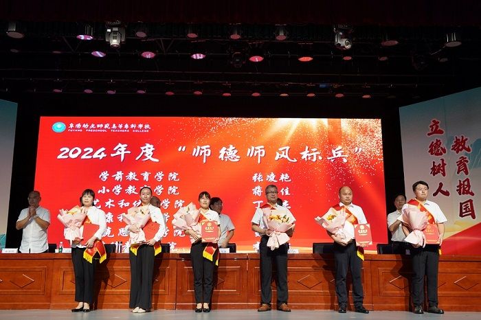 会上,校党委委员、纪委书记刘海涛带领新入职教师进行了入职宣誓;校党委副书记于华献宣读了《关于开展 2024年师德师风标兵、优秀教师、优秀教育工作者、优秀辅导员、优秀创新团队评选表彰工作的通知》,对丁传杰等6名“师德师风标兵”、马慧等15名“优秀教师”、王芮等15名“优秀教育工作者”、于静等6名“优秀辅导员”、小学教育专业创新团队等4个“优秀创新团队”予以表彰,并现场为先进集体和先进个人颁奖。