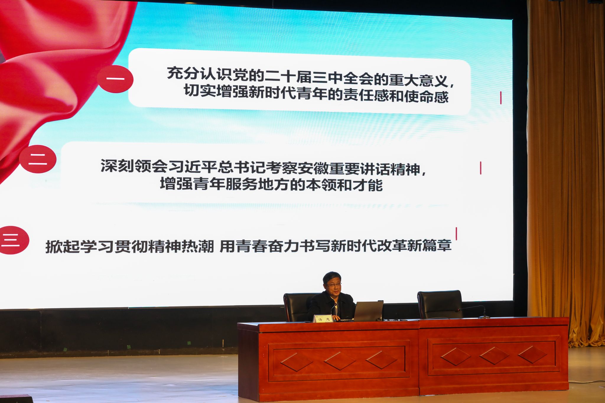 汤志的宣讲报告,围绕充分认识党的二十届三中全会的重大意义,切实增强新时代青年的责任感和使命感;深刻领会习近平总书记考察安徽重要讲话精神,增强青年服务地方的本领和才能;掀起学习贯彻精神热潮,用青春奋力书写新时代改革新篇章等三个方面展开。