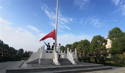 7点10分,在全体师生的注目礼下,英姿飒爽的国旗护卫队队员迈着矫健的步伐护送鲜艳的五星红旗入场,在场全体师生对国旗行注目礼,齐唱国歌,国旗在庄严的国歌声中冉冉升起,迎风飘扬。
