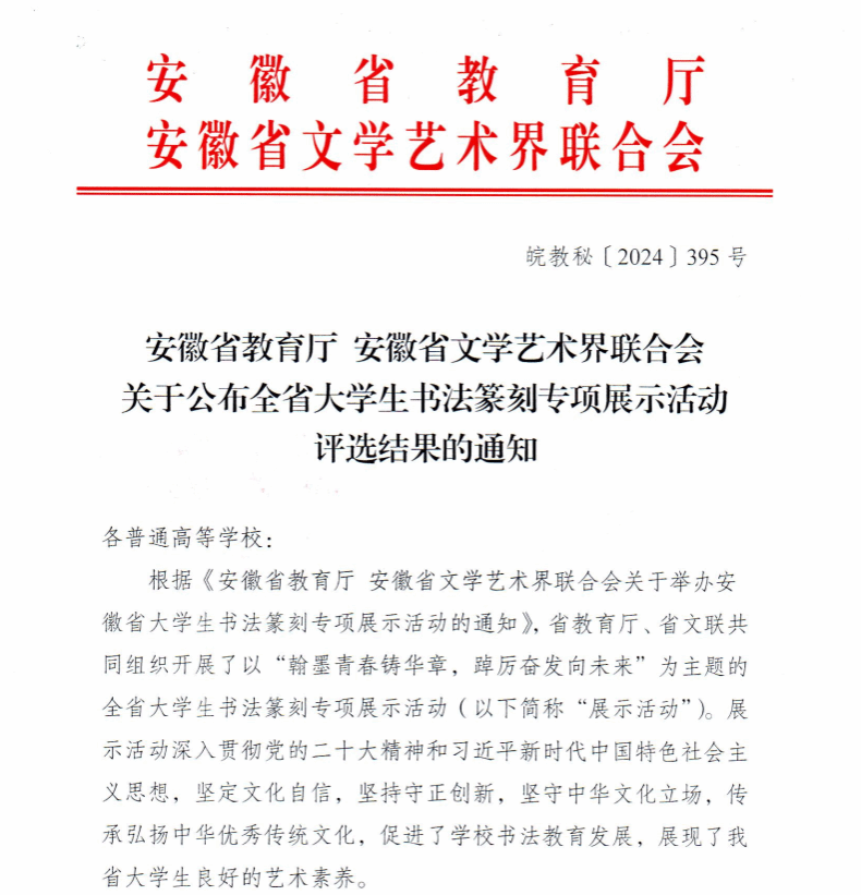近日,由安徽省教育厅与安徽省文学艺术界联合会主办、安徽省书法家协会与安徽师范大学承办的安徽省大学生书法篆刻展示活动圆满落幕。本次比赛是安徽省大学生科学和技能竞赛B类赛事项目,我校学子在此次展示活动中表现优异,共斩获一等奖1项,二等奖5项,三等奖4项,上报作品全部获奖。