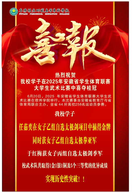 6 月 22 日,2025 年安徽省学生体育联赛大学生武术比赛在宿州学院落幕。本次赛事由安徽省教育厅与省体育局联合主办,全省 44 所高校 258 名运动员同场竞技。我校学子任茹奕在女子乙组自选太极剑项目中勇夺金牌,同时斩获女子乙组自选太极拳亚军;于红梅获女子丙组自选太极剑季军。校武术队队员在枪术、南棍、太极拳等 7 个项目中表现亮眼,最终取得 1 金 1 银 1 铜及 5 个三等奖的优异成绩。