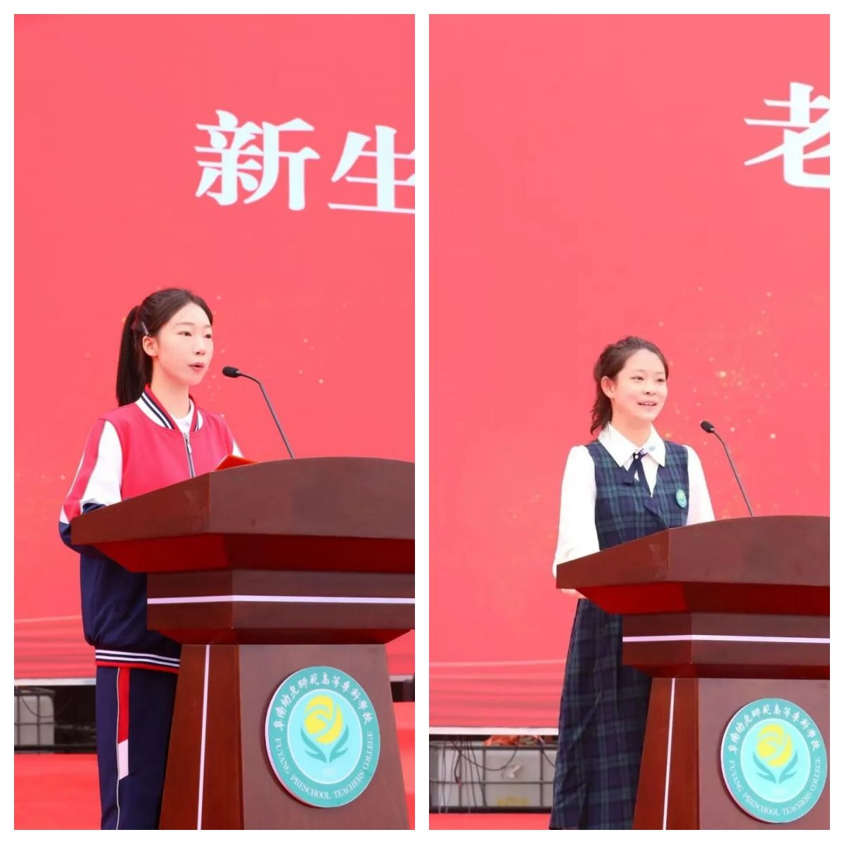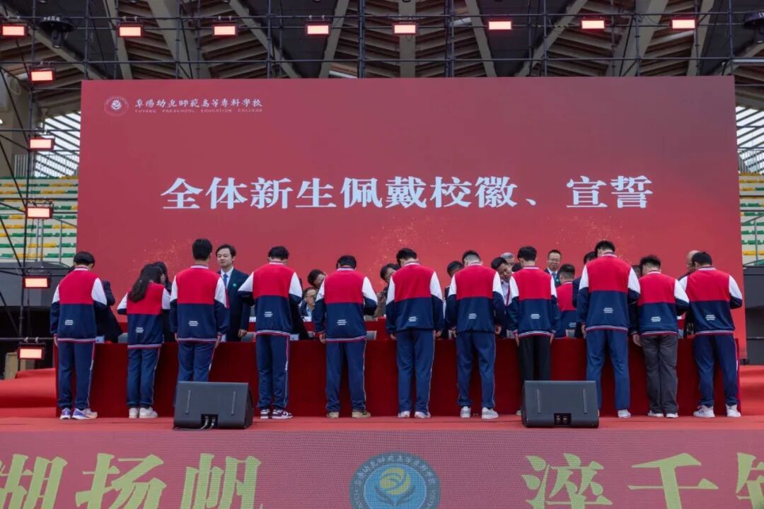 典礼上,校领导们为2025级新生佩戴校徽,台下新生自行佩戴校徽。校徽贴襟之时,标志着新生们从此与阜幼专血脉相连,更意味着新生接过阜幼专的初心和使命,成为真正的“阜幼专人”。
