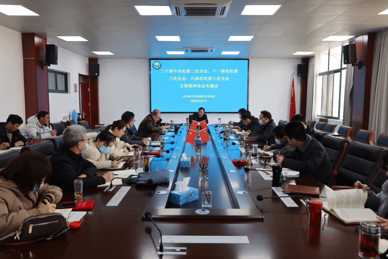 会上,校纪委副书记、监察室主任郑长胜传达了习近平总书记在二十届中央纪委二次全会上的重要讲话精神和省委书记郑珊洁在十一届省纪委三次全会上的讲话精神。通报了市纪委六届三次全会召开情况,传达了市委书记孙正东全会上的重要讲话,领学了市委常委、市纪委书记章绍伟在全会上题为《深入学习党的二十大精神 一刻不停推进全面从严治党 为加快建设现代化美好阜阳提供坚强保障》的工作报告。