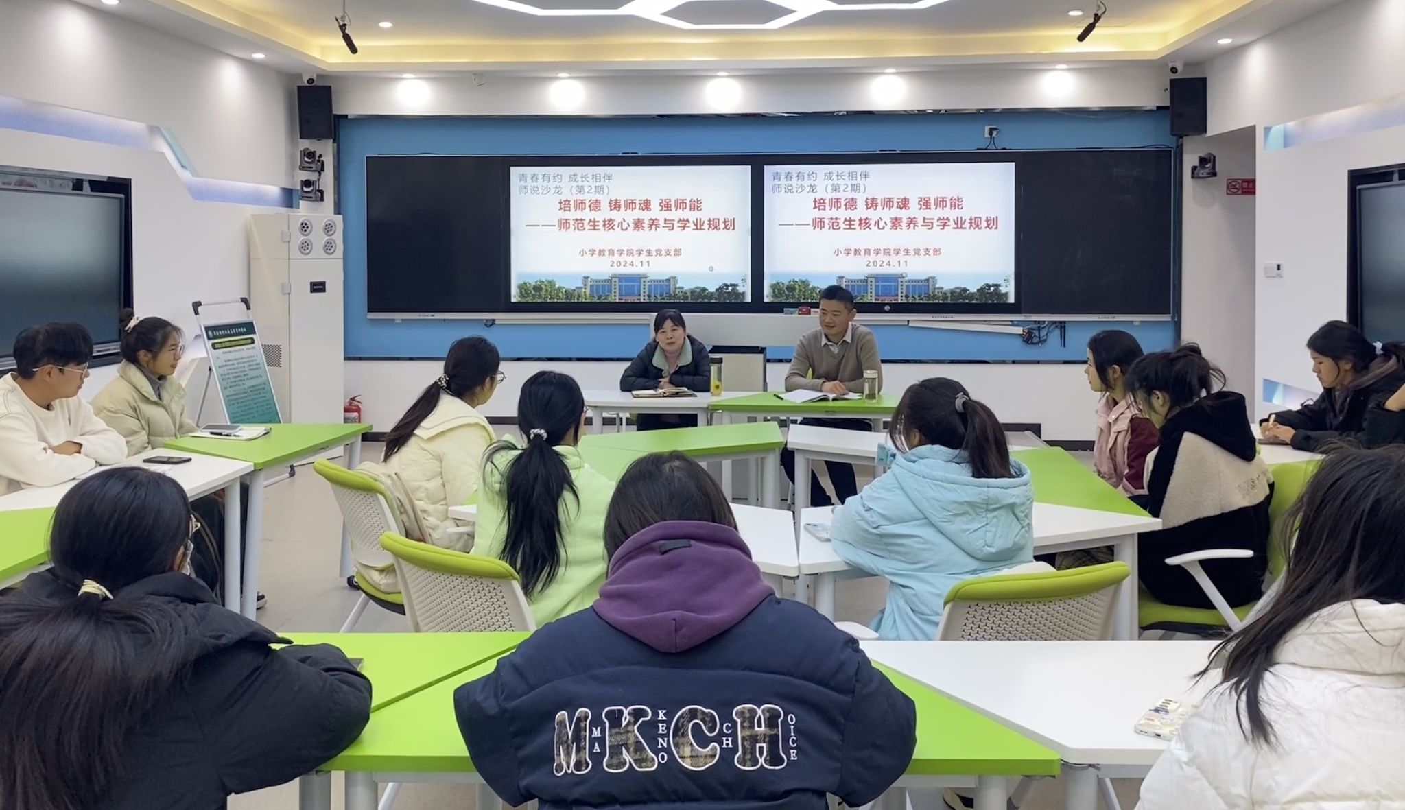 为帮助2024级新生明确自身定位,加强学业规划,增强职业认同感,提升职业素养,促良好学风的形成,11月28日下午,由我校辅导员名师工作室主办,小学教育学院学生党支部承办的师说沙龙(第2期)以“培师德 铸师魂 强师能——师范生核心素养与学业规划”为主题,在文津楼401成功举办。本期师说沙龙邀请了小学教育学院院长郭玉敏,2024级各班学习委员和学生代表参加,活动由小学教育学院学生党支部书记刘磊主持。