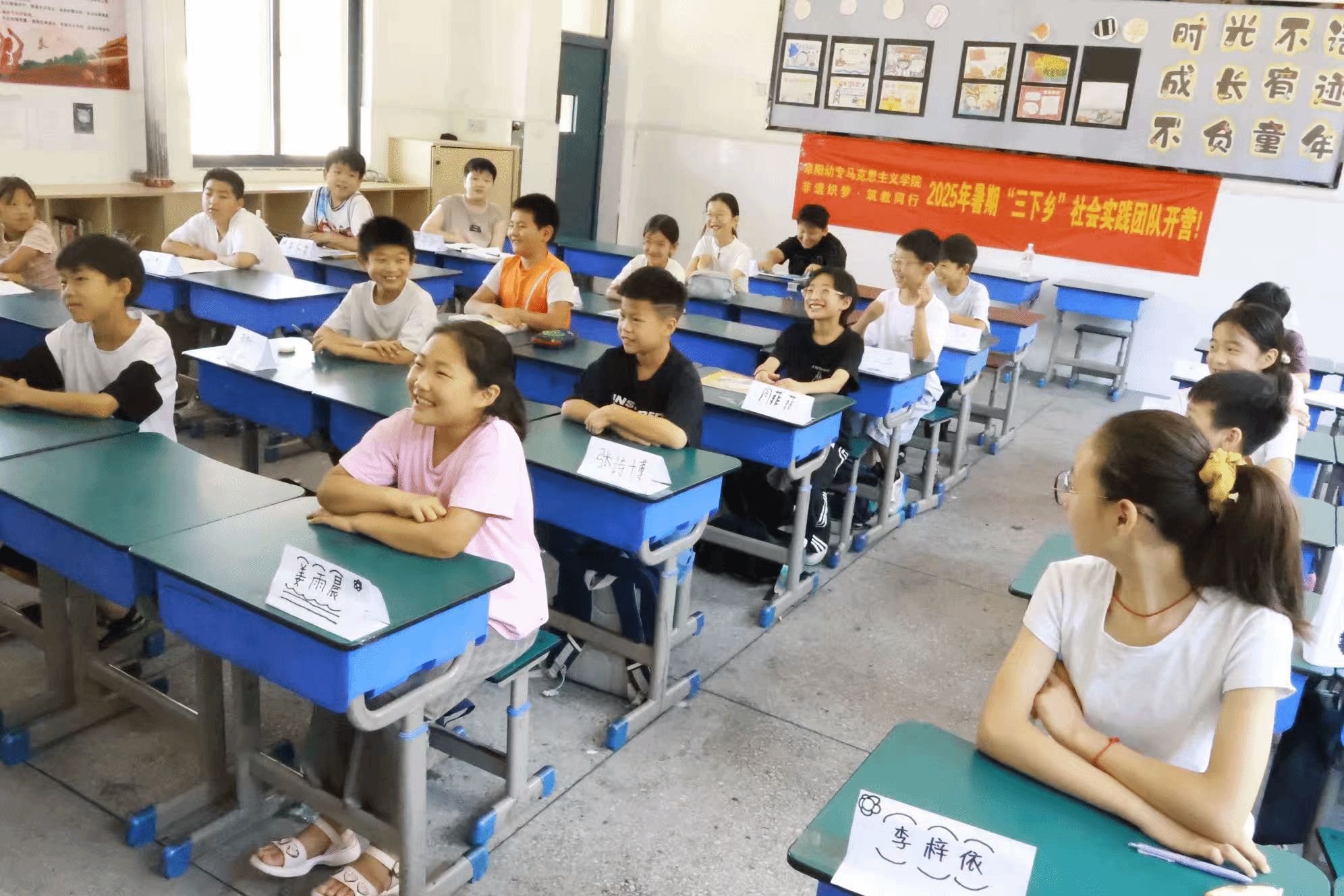 团队分成两队,分别前往黄岗镇中心小学和李寨村教学点,开启了充实而有意义的教学活动。首先,大家通过让孩子们绘制自己姓名卡片的方式进行破冰,