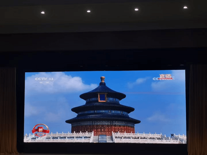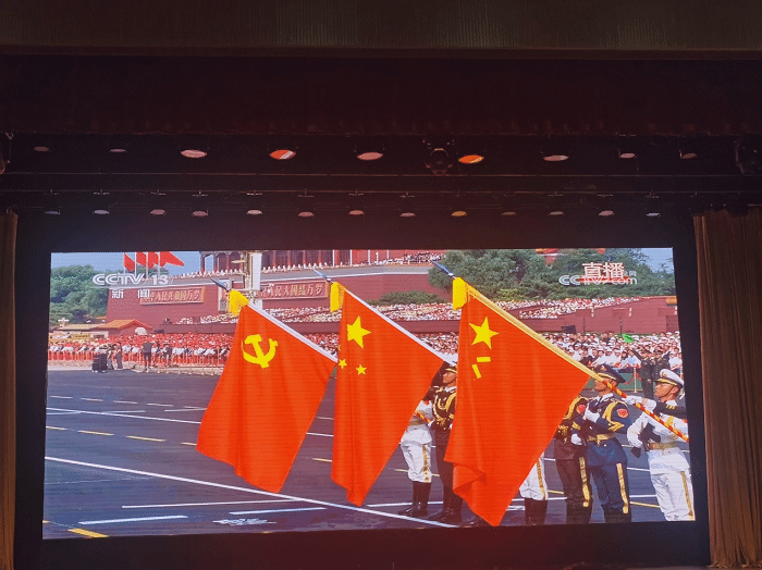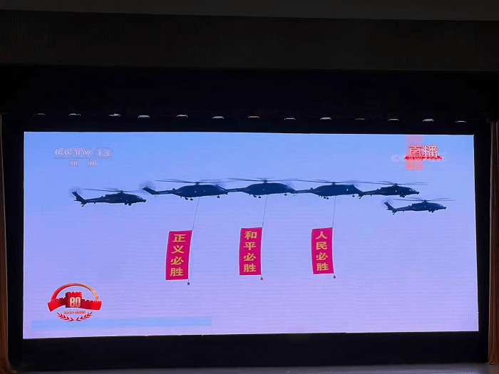观看过程中,全体教师全神贯注,看到受阅官兵威武雄壮的英姿和新型武器装备的先进强大,民族自豪感油然而生,为祖国今日之强大感到无比骄傲。
